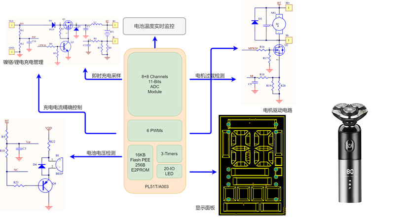 本方案采用PL51T/A003芯片,芯片內(nèi)集成16KB-flash,256Byte真EEPROM,11Bit-ADC, 6路PWM等豐富資源; 方案軟件實(shí)現(xiàn)鎳鉻鋰電充電管理,過沖過放等保護(hù);電機(jī)驅(qū)動(dòng)和電機(jī)卡死等異常防燒機(jī)功能;面試動(dòng)態(tài)顯示使用時(shí)間,剩余電量評估等功能。