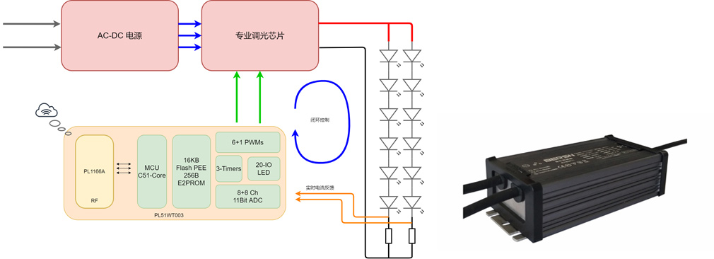 本方案采用PL51WT003芯片,芯片內(nèi)集成16KB-flash,256Byte真EEPROM,8+8路11Bit-ADC, 6路PWM等豐富資源,同時(shí)片上集成了PL1166A射頻芯片,實(shí)現(xiàn)無(wú)線遙控等功能; 方案實(shí)時(shí)采集各路燈珠的電流,做到燈珠電流閉環(huán)精準(zhǔn)控制, 能夠有效避免燈珠長(zhǎng)時(shí)間使用造成的亮度降低問(wèn)題;